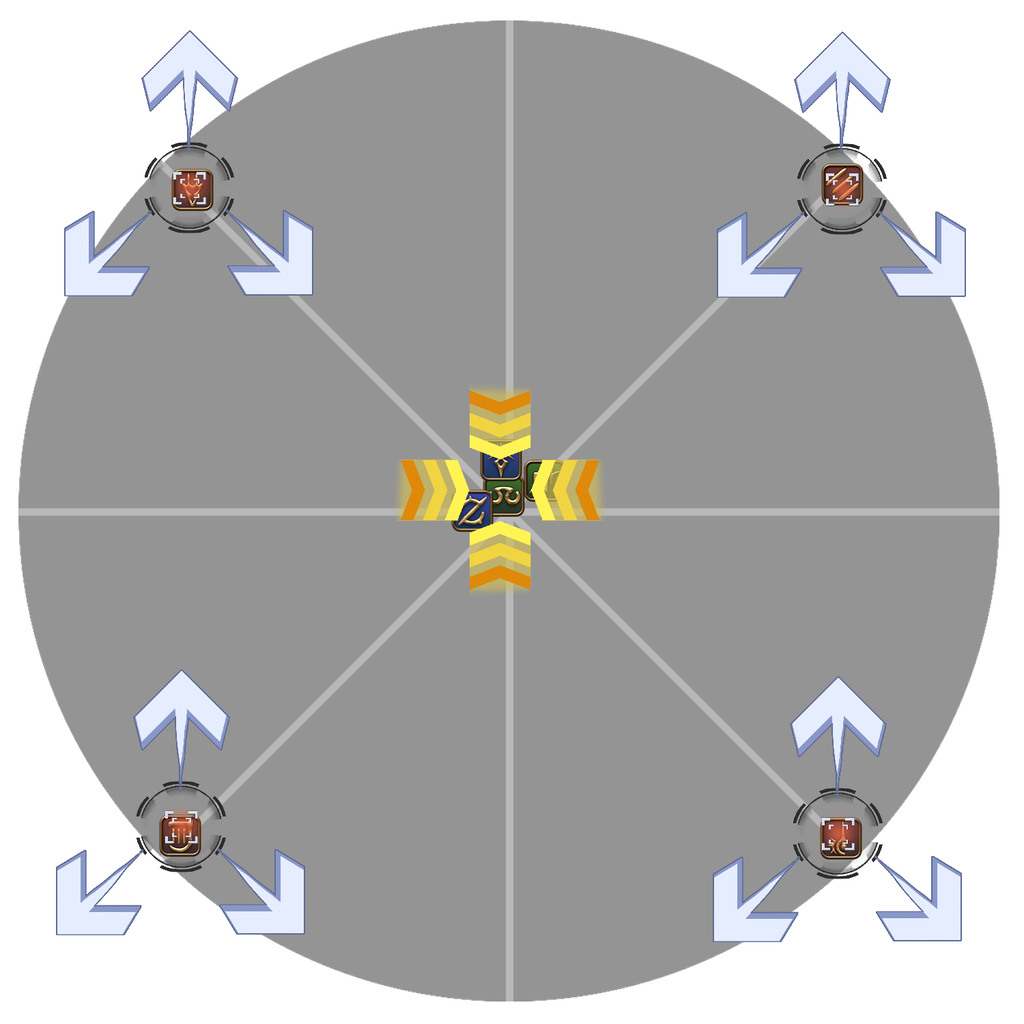中央の分体はボスの向いている向きに180度範囲攻撃、四角形に出現した分体は2体が所謂ダイナモ、残り2体が円形範囲を放つ。