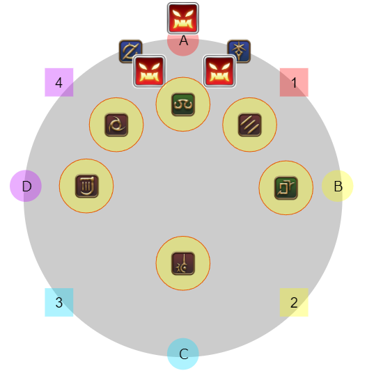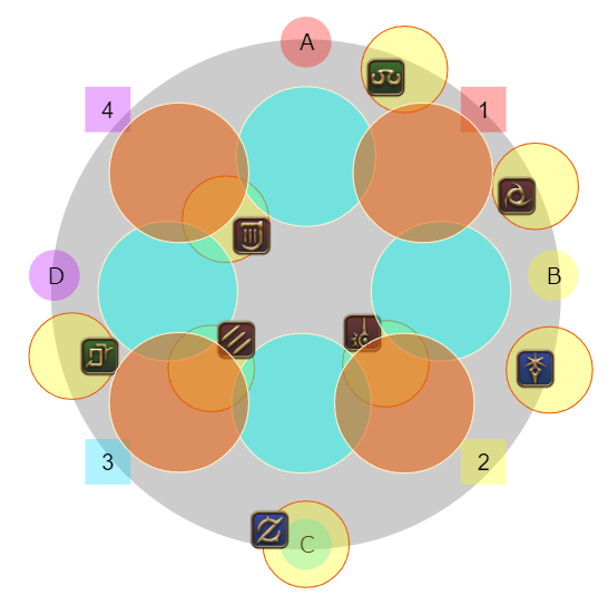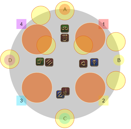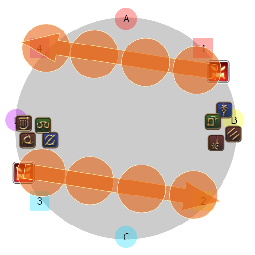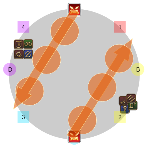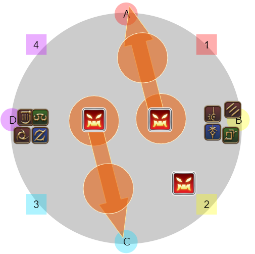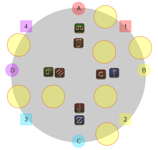 4名ずつ(基本はDPSがD、ヒラタンクがBだが入れ替わりあり)に分かれて1のマーカーがついたプレイヤーはゼフィランから遠い側、2は近い側になるように東西に散開し視線攻撃を避ける。