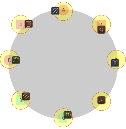 塔を踏む。このとき、前の散開時に外周側に塔が1本しか無いときはDPSが内周側の塔を踏む(この図だとモンク、赤魔道士)