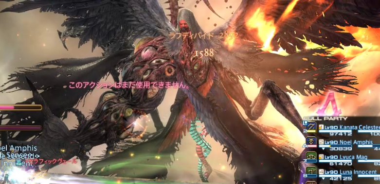 強烈な全体攻撃、時間切れまでに3回放たれる。最終フェーズではボスが何かを詠唱するたびに与ダメ上昇のバフが付与されるため、後ほど痛い。