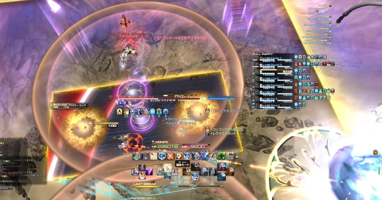 ボスの右手左手それぞれに重力球のようなものがそれぞれ4つずつ出現。一定時間経過でそれぞれの手から近い人(?)またはそれぞれの足場に居る人1人ずつに球が飛んでくる。
