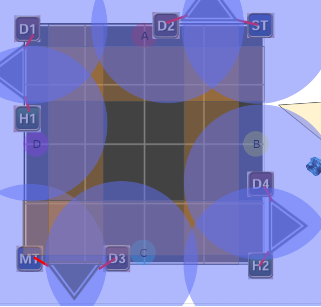 もう1人はアルファベットマーカー付近で角へ行ったプレイヤーの大円範囲に被らない位置ギリギリに立つ。