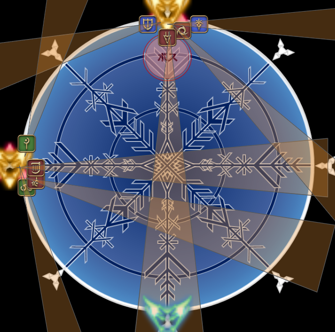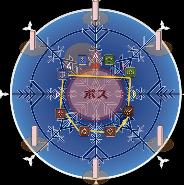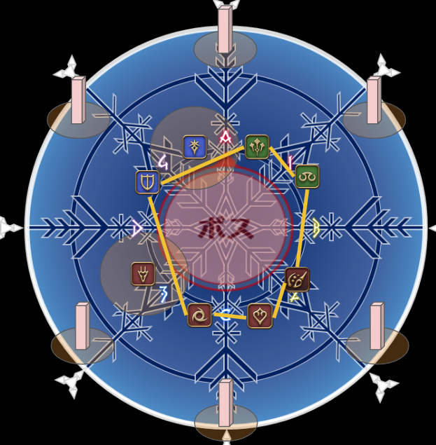 ちなみに線伸ばし+頭割りは頭割り対象者を見て塔のを判断しないといけないパターンも理論上存在していたが、どうやら頭割りは線で結ばれた人間の中から隣り合ったペアで付くのでない。