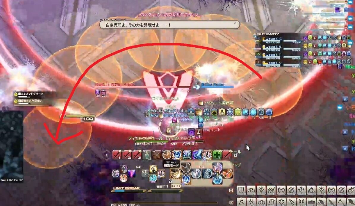 全員中央に引き寄せ後、バインド。さらに続けて小円範囲が出現、これはバインドされたプレイヤーを囲って円を描くように出現する。