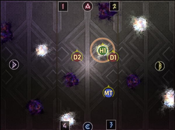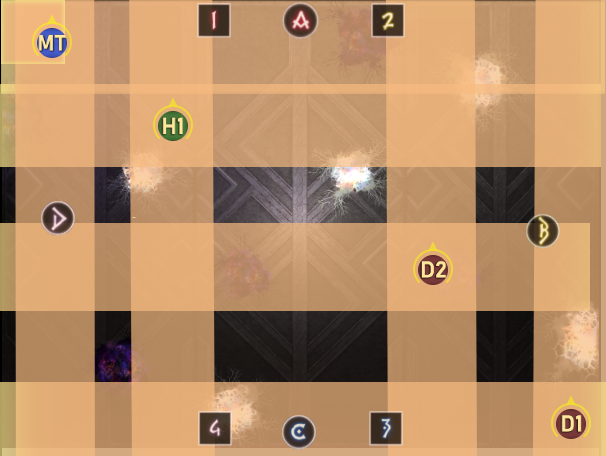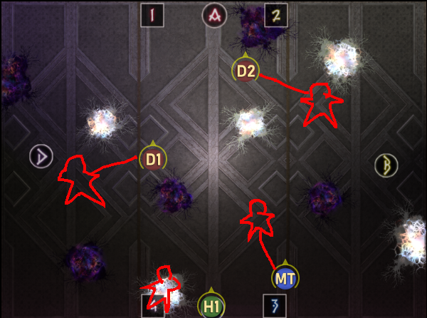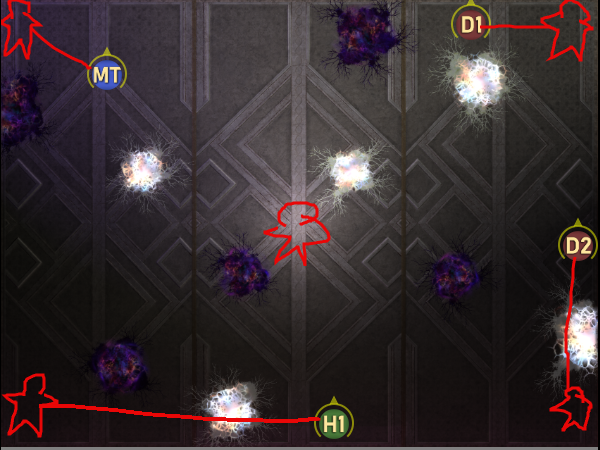 まず中央へ集合し、デバフ付与を確認してTHが北西、DPSが南東へ走って鎖を解除する。