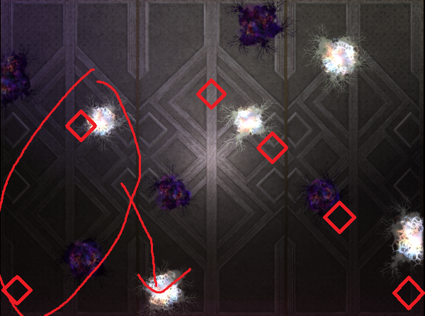 D2は右下の黒床に敵をぶつけないために少し南東に敵を引っ張り、黒床の南を通した後に北上していく。