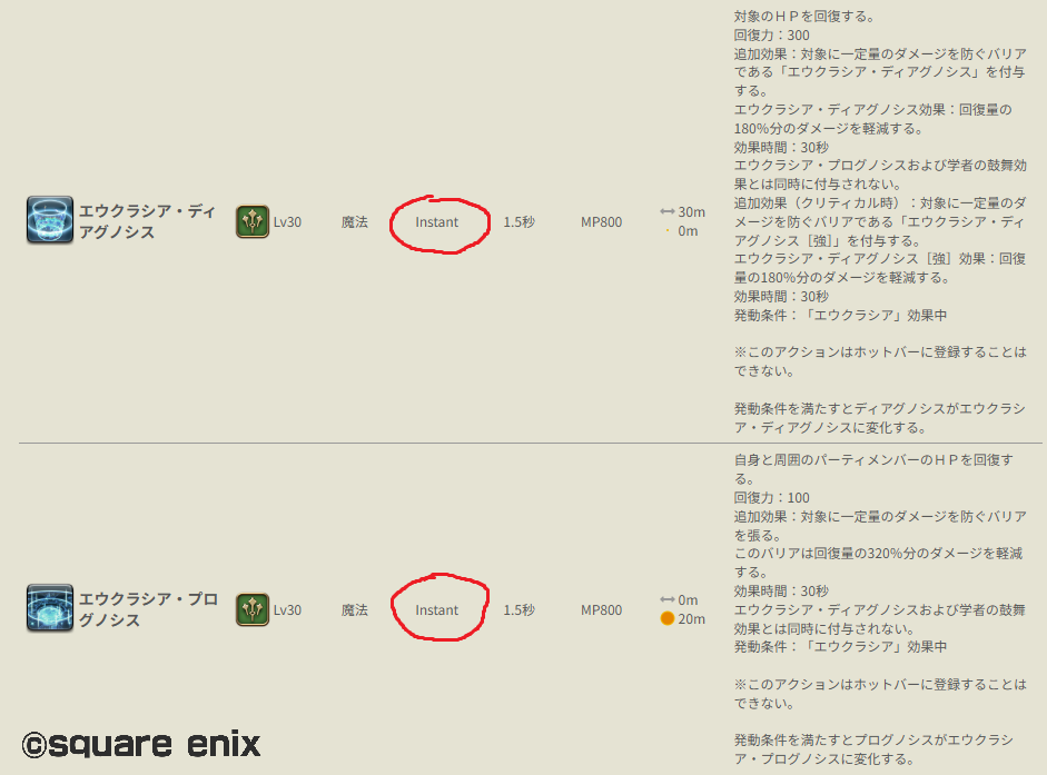 一方で、あまり言及されることはありませんが、学者が持っている明確な強みとして、意気軒高の策の方がエウクラシア・プログノシスⅡよりも回復力が 100 高くなっている点が挙げられます。その為、全体攻撃に毎回バリアを貼るようなヒールワークの場合、学者の方が供給ヒール量が多くなることもあります。零式や絶の初期攻略においては、学者のヒール力不足が問題になることはあまり無いでしょう
