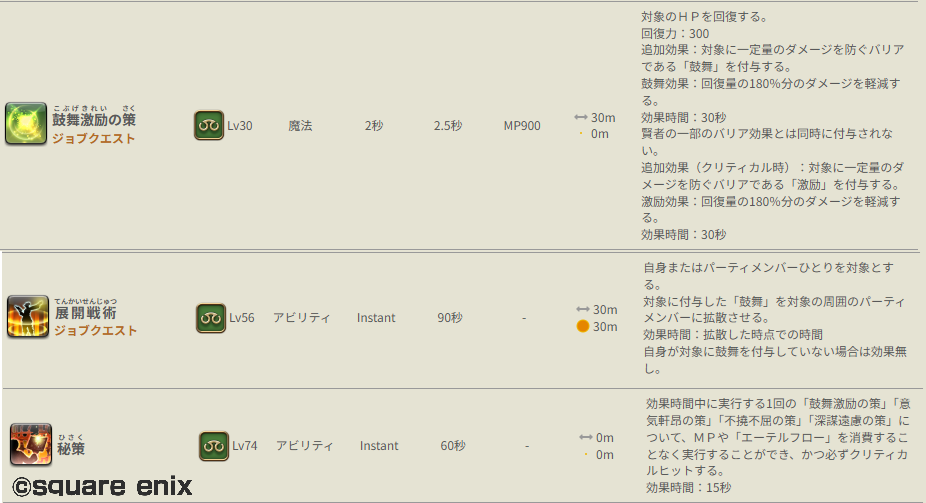 └賢者がプネウマ、ホーリズム等を用いて火力ロスの無いヒールを行える一方で、学者は展開戦術・フェイイルミネーションのように火力ロスを伴うヒールを行わないと恩恵を得づらいスキルや、疾風怒濤の計のようにヒールには寄与しないスキルが多くなっています。