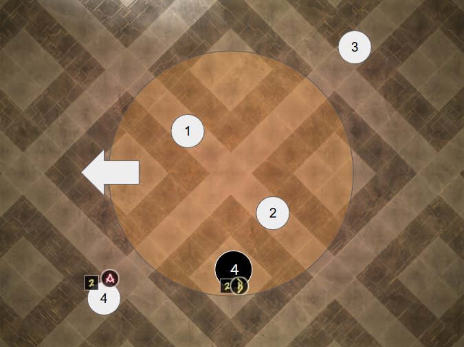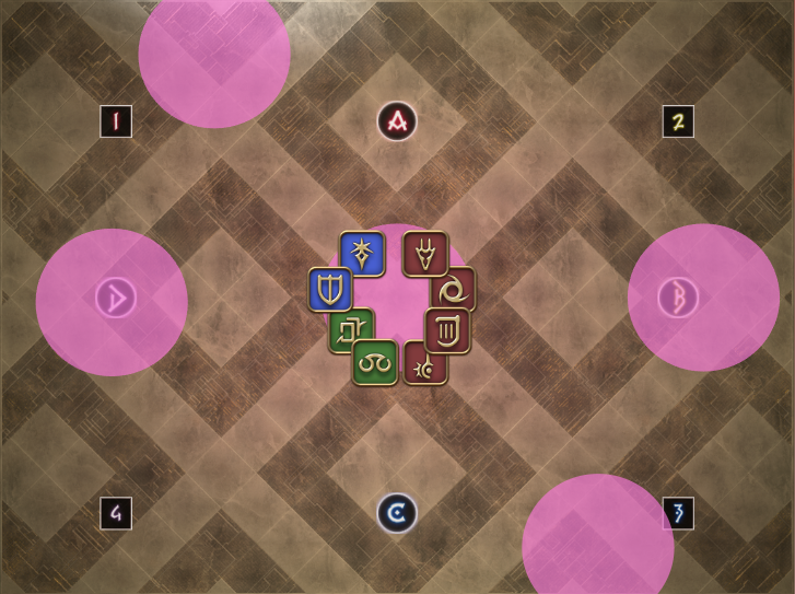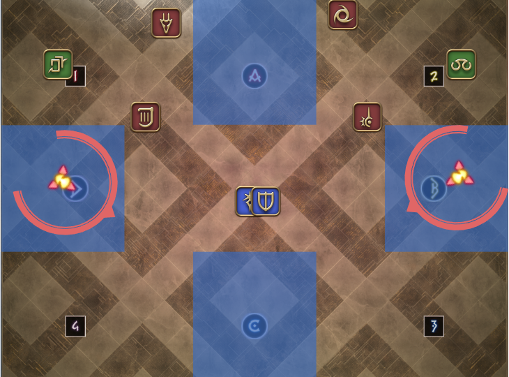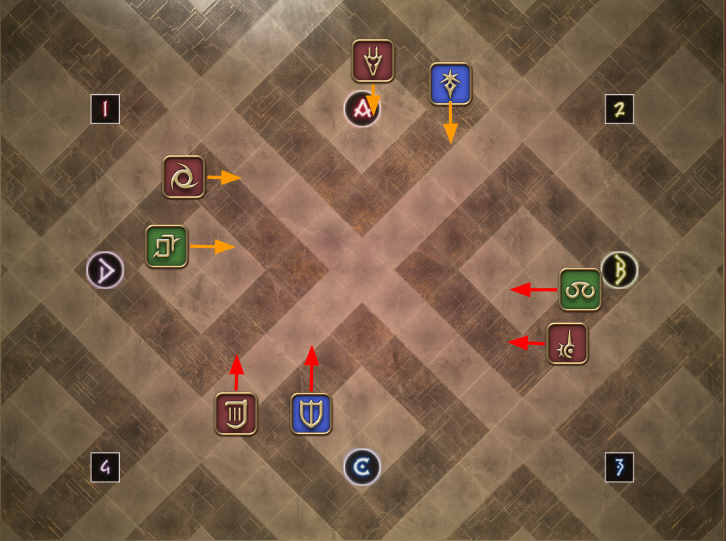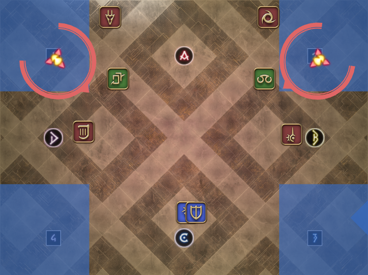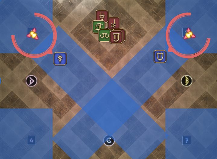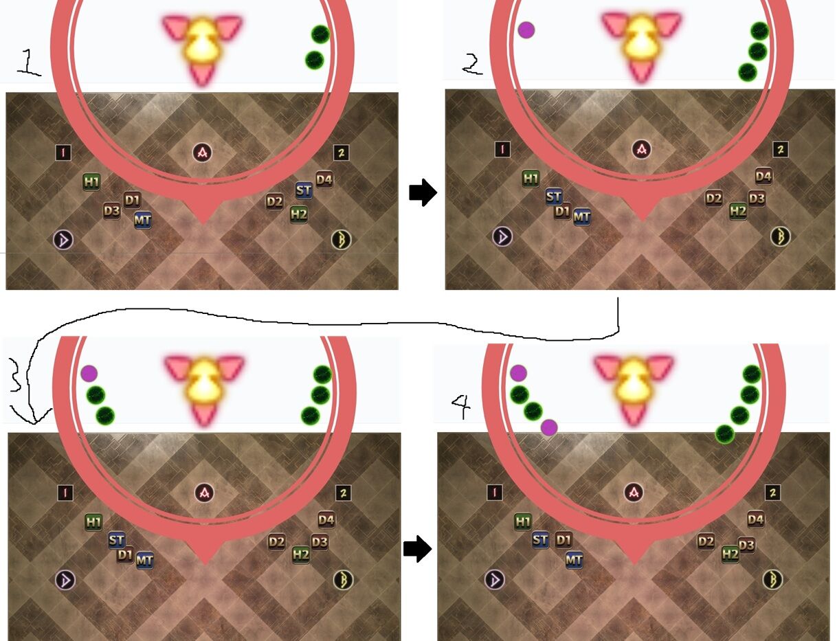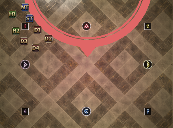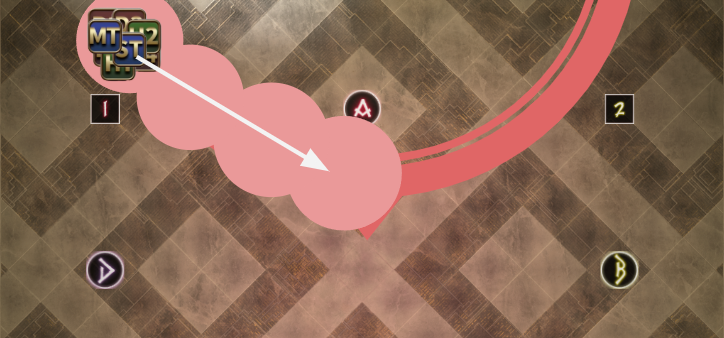 その後斜めのうちで内側に出なかった2方向(1/3マーカー方角に内側AoEが出たなら2/4マーカー方向)のフィールド外側に2つ順番にAoEが出現、日本語ではわかりにくいが図を見ればわかると思う。