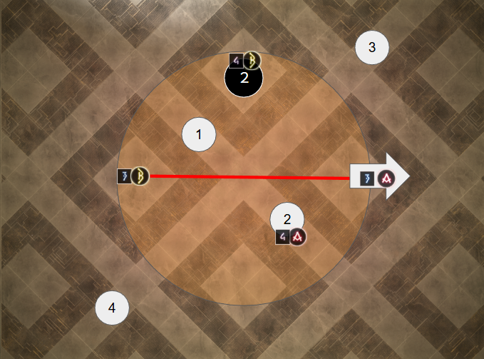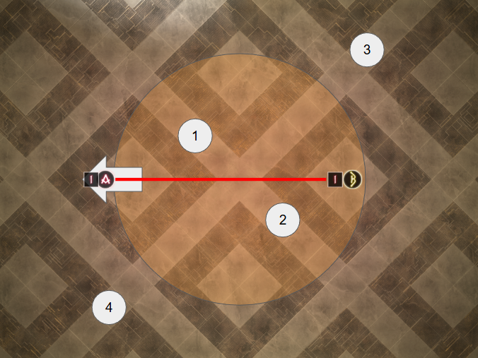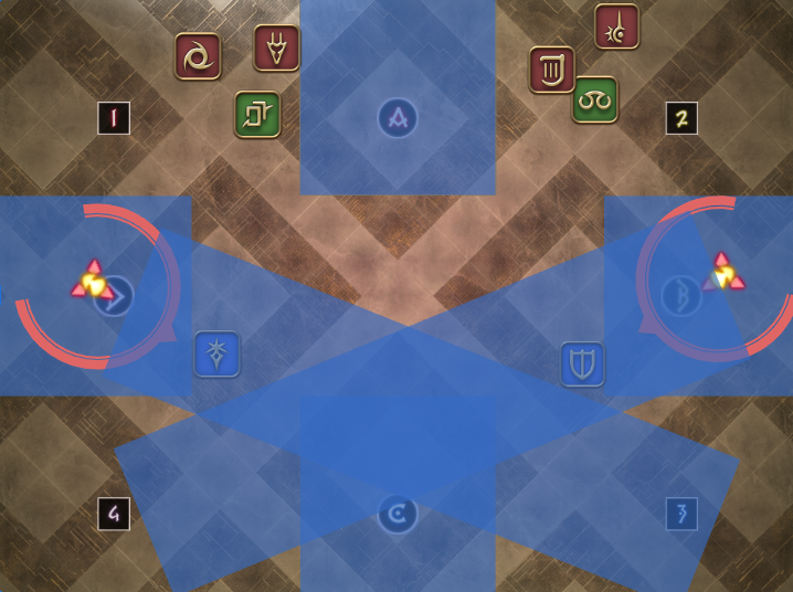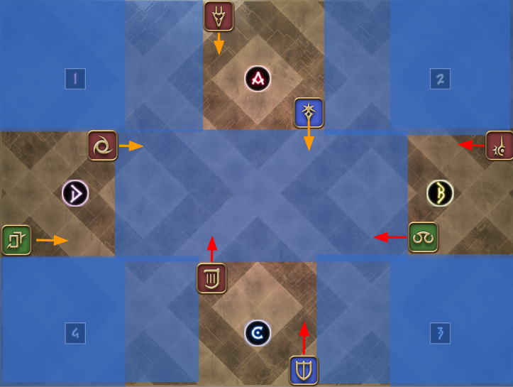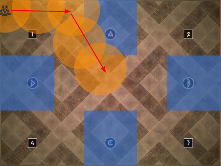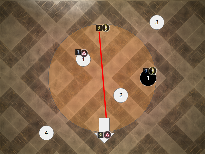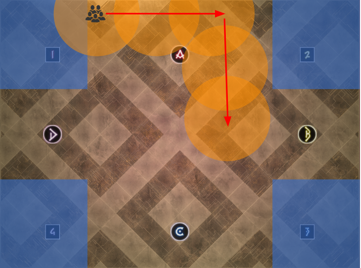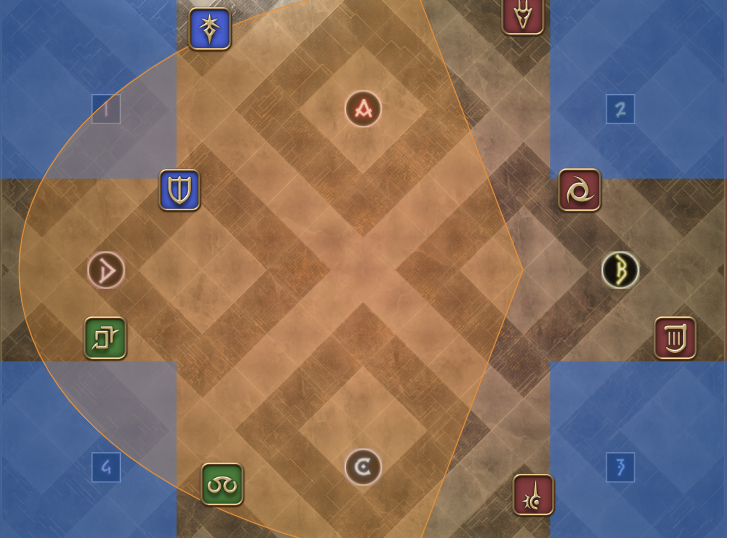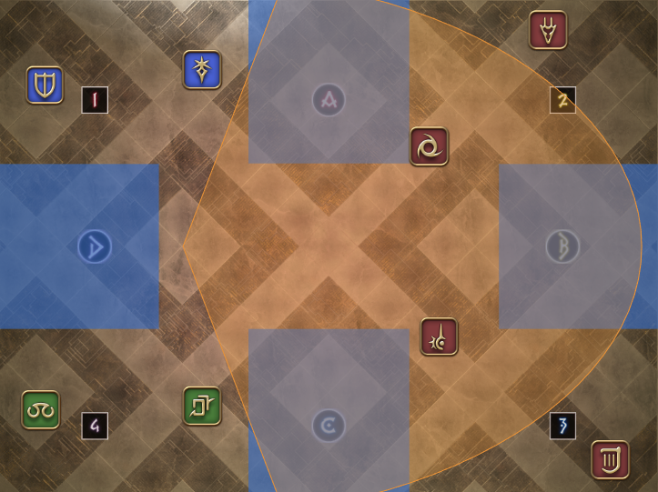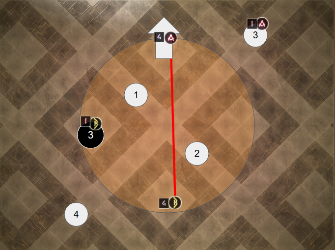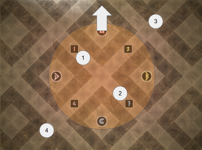 その後斜めのうちで内側に出なかった2方向(1/3マーカー方角に内側AoEが出たなら2/4マーカー方向)のフィールド外側に2つ順番にAoEが出現、日本語ではわかりにくいが図を見ればわかると思う。