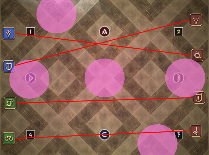 このように立たず先ほどのX字パターンのように全員が右前左後に立ってしまうと塔出現時のAoEがまあまあ大きい円範囲であるため、それが被って死んでしまう。